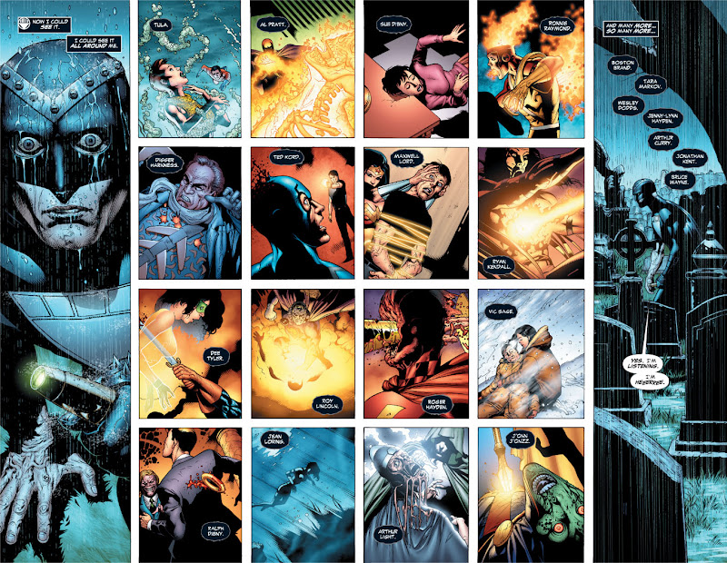 Seja aqui neste mundo nosso ou no Universo DC ou qualquer Universo do Mundo Da Imaginação, a ignorância humana é bastante grandiosa em relação aos Mistérios Da Morte. Há ignorância fecunda, profunda, insistentemente irrealizadora d'alma, plenamente incentivadora de cegueiras espirituais várias. A grande jogada da Blackest Night, na brilhante mente de Geoff Johns, está na intenção de fazer-nos ter uma nítida idéia mui real acerca de dita ignorância. Geralmente, como possuimos em alguma época de nossas Existências, a atual e as anteriores, idéias infantis acerca do Pós-Morte, essas lembranças podem sobreviver ou morrer definitivamente em nós; e se, no entanto, a inocência se transfere para outro tipo de ilusão, como, por exemplo, a de alguns jovens se sentirem “belos e imortais”, agindo arrogantemente em relação ao comum viver, maltratando os idosos e pensando que nunca envelhecerão, enfraquecerão e beijarão A Foice empunhada por Tanatos? Não precisamos de avançados conhecimentos espiritualistas, e até filosóficos, para chegarmos à conclusão de que nós, ao desencarnarmos, não iremos para nenhum “Paraíso” ou “Inferno” a não ser os vários Paraísos e Infernos que criamos dentro de nossas almas conforme as nossas ações em pensamento ou plenamente materializadas. Isto quer dizer que tanto os heróis quanto os vilões e as pessoas comuns que criaram os seus Paraísos e Infernos retornarão desejosos de uma vingança contra os que aqui ficaram relacionada a essas internas criações. E se na história envolvendo o retorno de todos os que se foram isso está bem nítido, podemos contar com um conteúdo MUITO MAIS PRÓXIMO DA NOSSA HUMANA REALIDADE DO QUE QUALQUER OUTRA CRIAÇÃO DOS QUADRINHOS QUE JÁ TENHA SIDO FEITA!!!