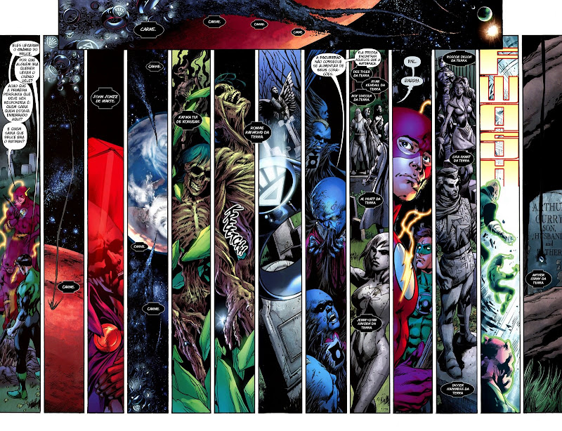 Zumbis atrás de nós, de todos nós... A mãe que fora há muito... O pai que fora há muito... O irmão que fora há muito... O filho que fora há muito... O primo que fora há muito... O avô que fora há muito... A avó que fora há muito... O tio que fora há muito... A tia que fora há muito... Os amigos que foram há muito... Os inimigos que foram há muito... Imaginem esta atmosfera de sombras em redor, tudo envolvendo, tudo tecendo, tudo movendo... Os zumbis dançantes em nosso redor... Os zumbis insistentes em nosso redor... “Por que nós morremos e vocês estão vivos?”, todos perguntariam... “Por que vocês não morreram junto conosco?”, todos perguntariam... “Por que nós temos que perdoá-los por estarem vivos?”, todos perguntariam... “Por que deixamos de viver para as luzes do mundo e vocês continuam viventes em tais luzes?”, todos perguntariam... “Por que não podemos caminhar junto com vocês de novo aqui neste mundo?”, todos perguntariam... É isso tudo que os personagens da DC enfrentarão na Blackest Night elevado ao infinito, como seria conosco se tal fenômeno ocorresse.